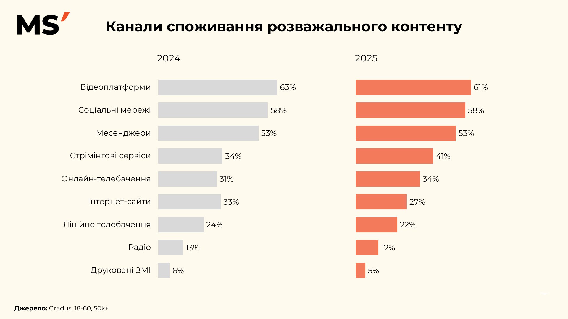 Соціальні мережі та месенджери залишаються стабільними – їхнє споживання не змінюється наступного року (58% та 53% відповідно). Це вказує на зростання ролі «контенту людей для людей» – короткі відео, гумористичні формати, реакції, стріми та інтерактиви продовжують формувати культуру споживання контенту в реальному часі.