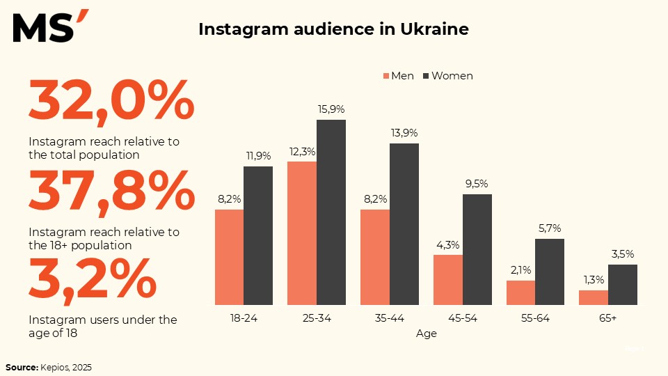 Today, Instagram reaches 32.0% of Ukraine’s total population and 37.8% of the 18+ audience, making the platform a stable tool for both mass and niche communications. At the same time, only 3.2% of users are under 18, clearly positioning Instagram as an “adult” social network focused on more conscious content and brand consumption.