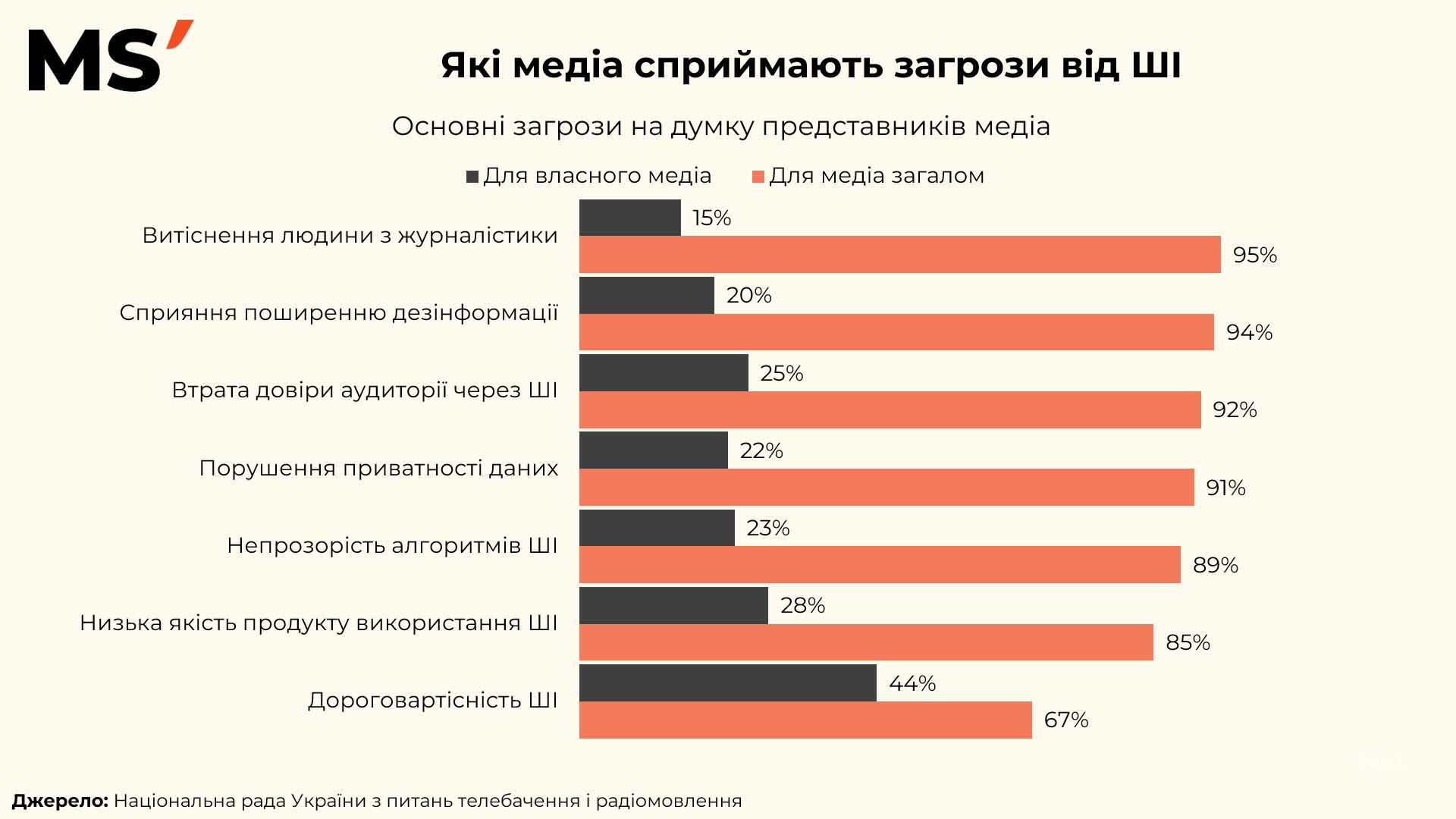 Найбільше занепокоєння викликає витіснення людини з журналістики (95%). Медіа бояться втратити унікальний людський фактор, який формує контекст, емоції та відповідальність за слово. Другий за масштабом страх — поширення дезінформації (94%), адже автоматизація створення контенту може сприяти появі великої кількості перекручених або фейкових матеріалів.