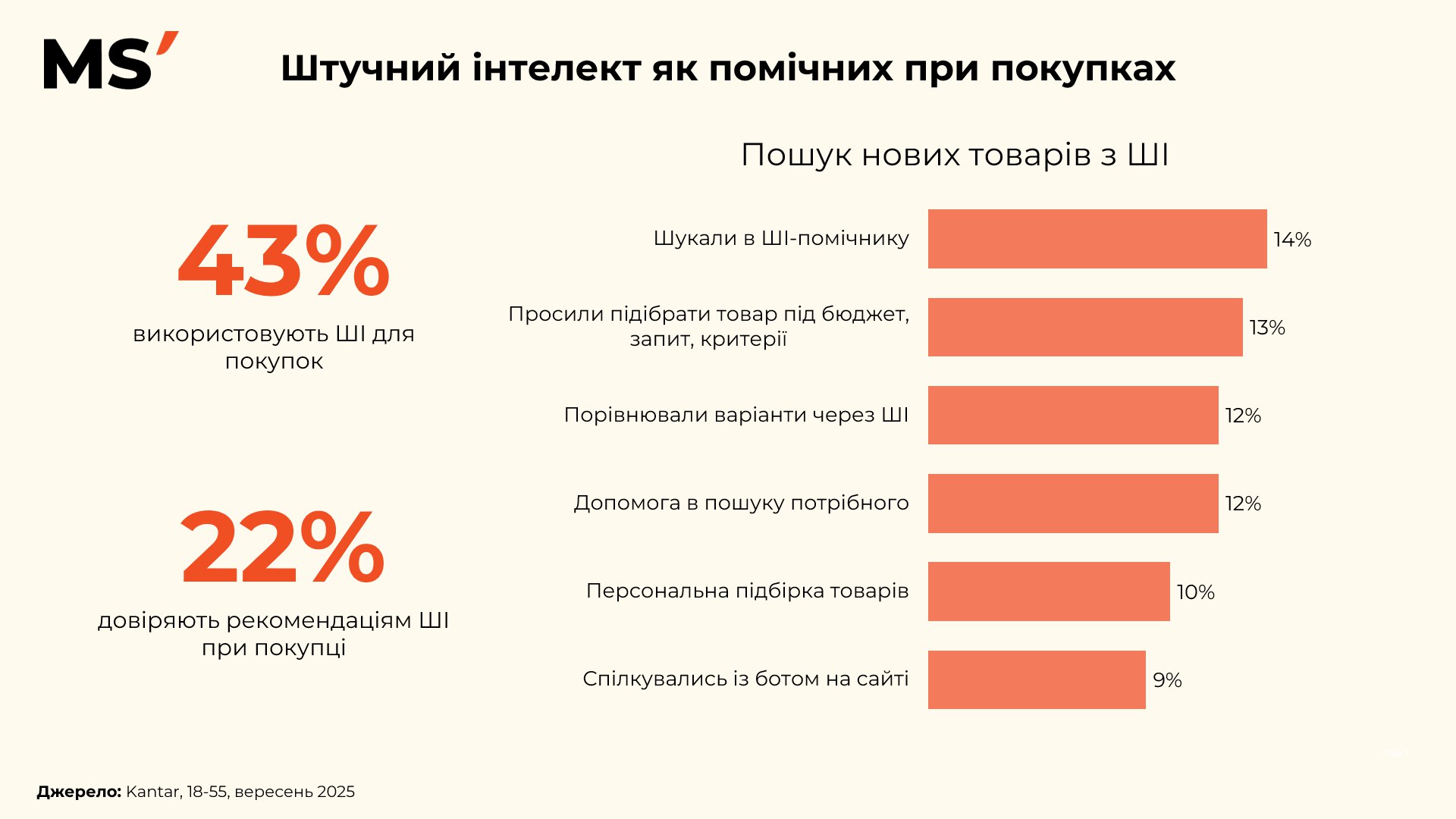 Шопінг змінюється. 43% українців уже використовують ШІ, коли шукають або обирають товар. Це означає не лише зручність, а й нову логіку поведінки споживачів, яку бренди повинні враховувати вже зараз.