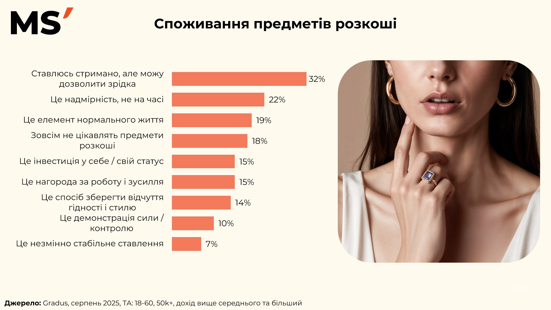 Водночас 22% респондентів прямо називають розкіш надмірністю, яка «не на часі». Ще 18% взагалі не цікавляться предметами розкоші, що підкреслює зсув фокусу від символічного споживання до базових і функціональних потреб.