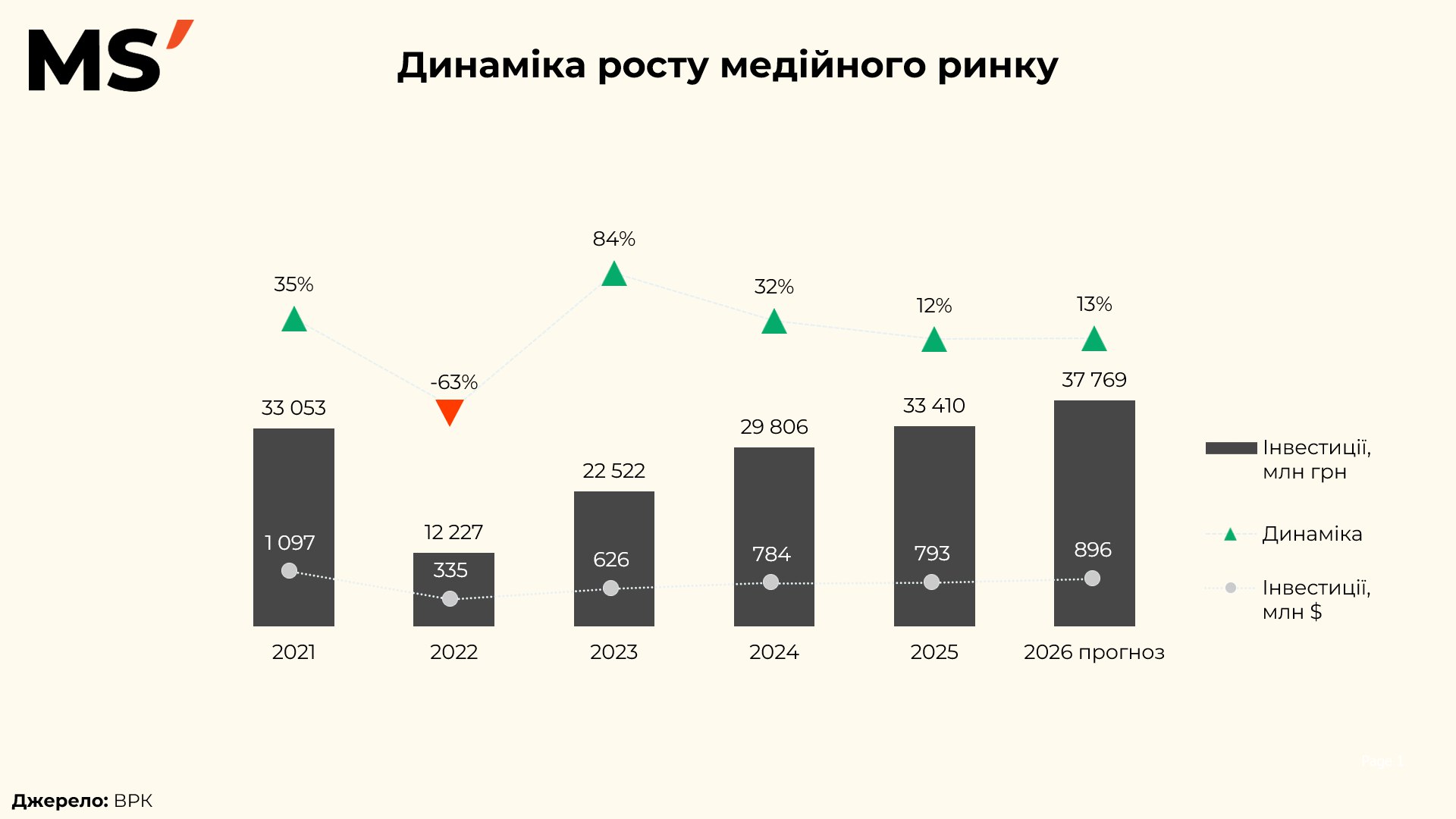 Якщо подивитись у доларовому еквіваленті, обсяг інвестицій у 2021 становив 1 097 млн $, у 2022 — лише 335 млн $, але вже у 2026 прогнозується відновлення до 896 млн $. Це свідчить не лише про адаптацію бізнесу до нової реальності, а й про повернення довіри до медійних інструментів.