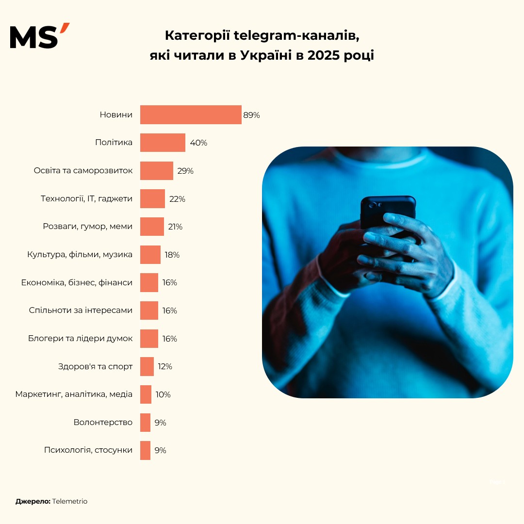 У 2025 році структура споживання контенту в Telegram виглядає максимально прагматичною. Абсолютний лідер — новини: їх читають 89% користувачів. Це ще раз підтверджує роль платформи як джерела оперативної інформації та альтернативи класичним медіа. На другому місці — політика з показником 40%, що логічно в умовах високої суспільної залученості.