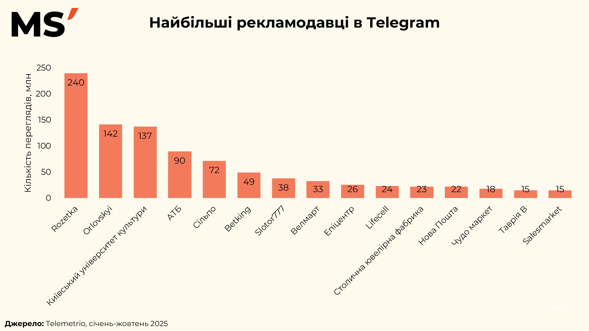Ринок реклами в Telegram в Україні чітко демонструє концентрацію уваги навколо кількох сильних гравців. За обсягом переглядів лідером виступає Rozetka — понад 240 млн переглядів, що суттєво випереджає інших рекламодавців. Далі йдуть Orlovskyi (142 млн) та Київський університет культури (137 млн), які також активно використовують Telegram як канал масштабного охоплення. У топі присутні й представники фінансового сектору — АТБ (90 млн) та Сільпо (72 млн), що підтверджує зростаючу роль месенджера для FMCG та ритейлу.