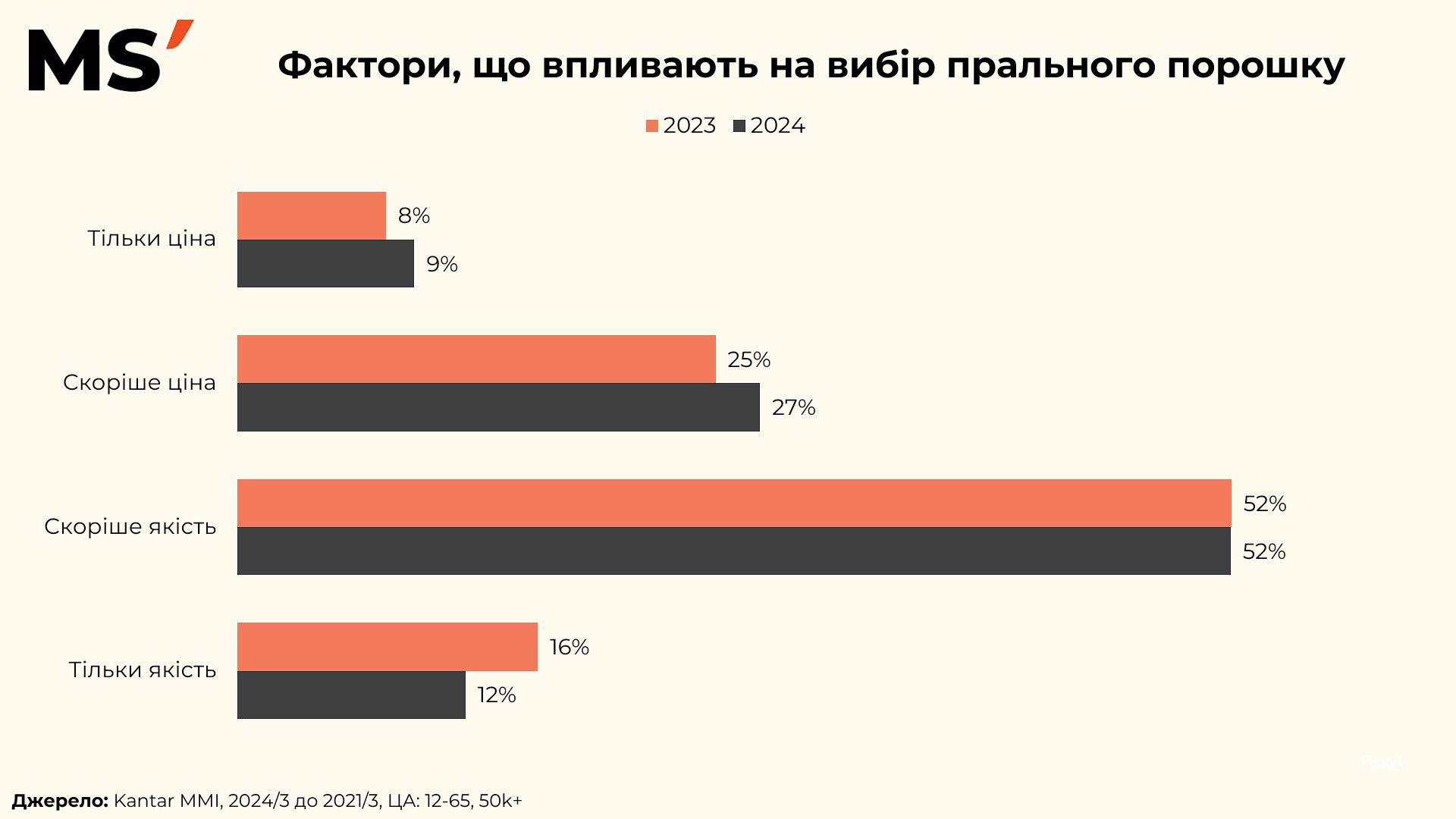 Ціновий фактор поступово набирав ваги. Якщо у 2023 році 25% респондентів керувалися принципом «скоріше ціна», то у 2024 ця частка зросла до 27%. Водночас частка тих, хто купував порошок лише за ціною, залишалася невисокою — 8% у 2023 та 9% у 2024. Це означало, що більшість споживачів розглядали вартість у контексті співвідношення «ціна-якість», а не як єдиний критерій.