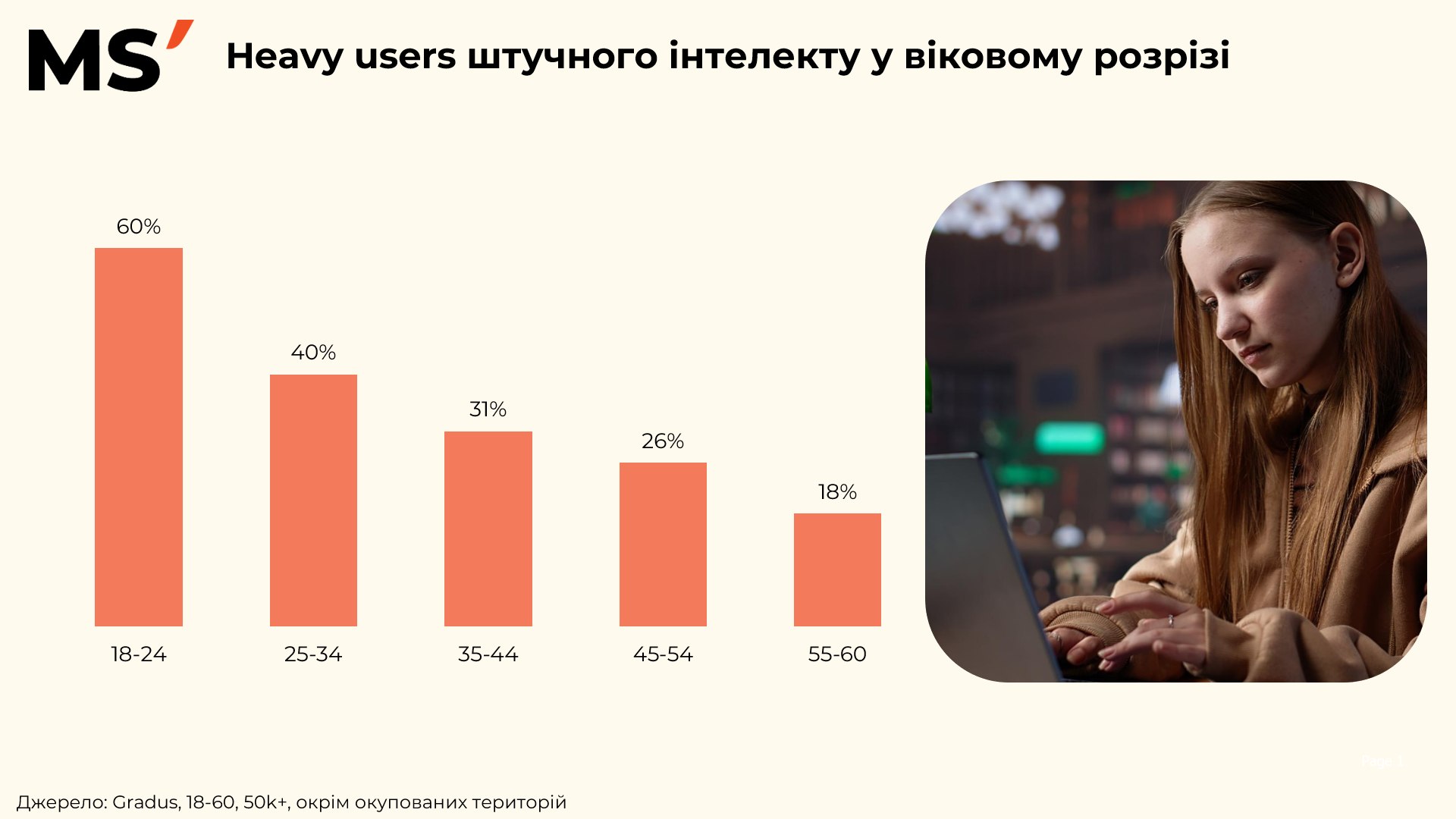 60% користувачів віком 18–24 років активно використовують ШІ на регулярній основі. У групі 25–34 цей показник знижується до 40%, далі — 31% серед 35–44, 26% у 45–54 і лише 18% у 55–60.